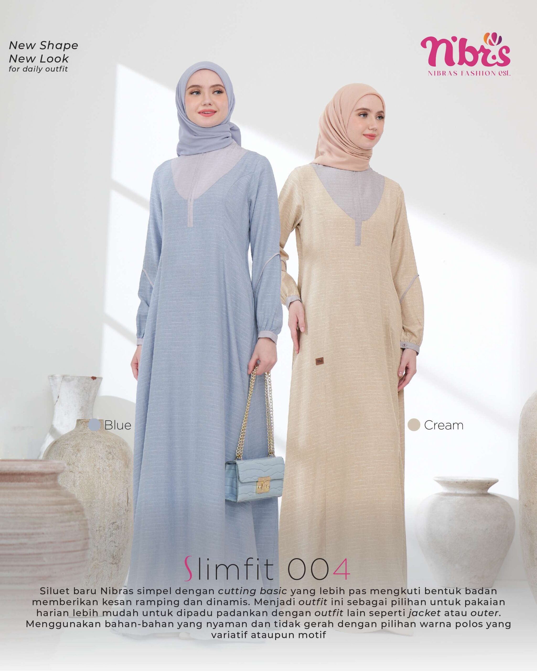 Siluet baru Nibras simpel dengan cutting basic yang lebih pas mengikuti bentuk badan memberikan kesan ramping dan dinamis. Menjadikan outfit ini sebagai pilihan untuk pakaian harian karena lebih mudah untuk dipadu padankan dengan outfit lain seperti jacket atau outer. Menggunakan bahan-bahan yang nyaman dan tidak gerah dengan pilihan warna polos yang variatif ataupun motif.